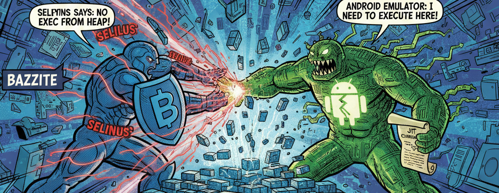 Bazzite utilise SELinux, le système de sécurité de Red Hat/Fedora. Et SELinux n’aime pas qu’on exécute du code depuis le heap (la mémoire dynamique). Devinez ce que fait l’émulateur Android ? Exactement ça.