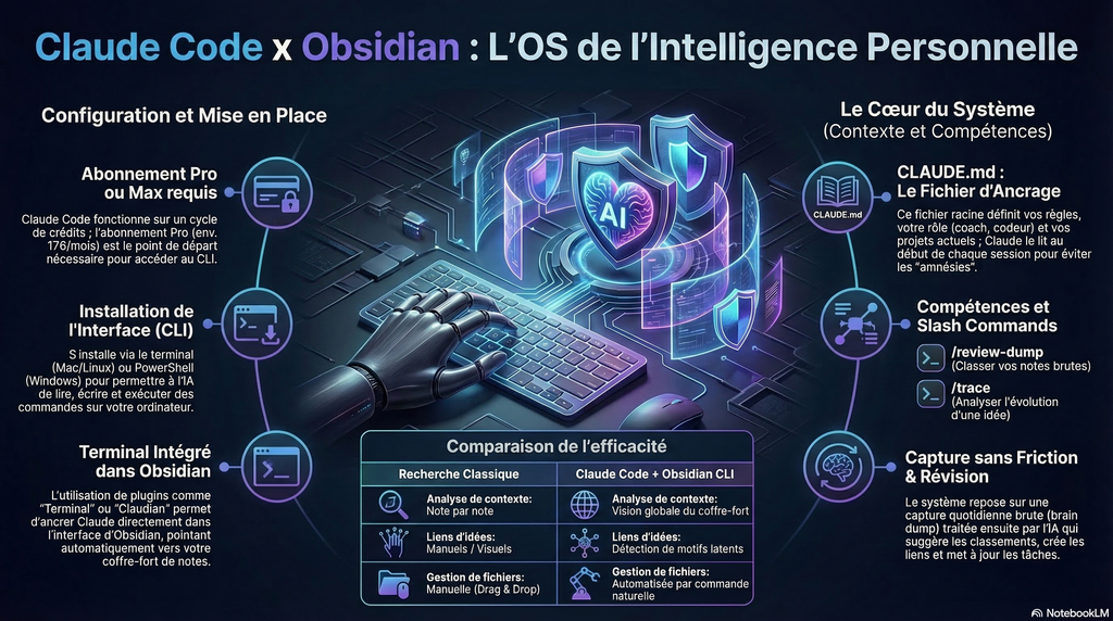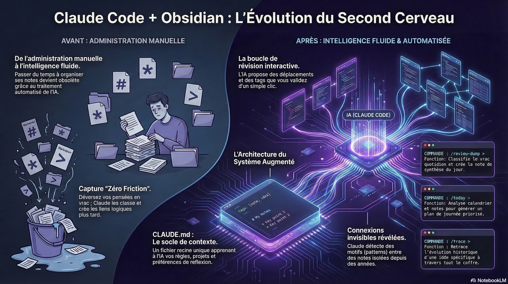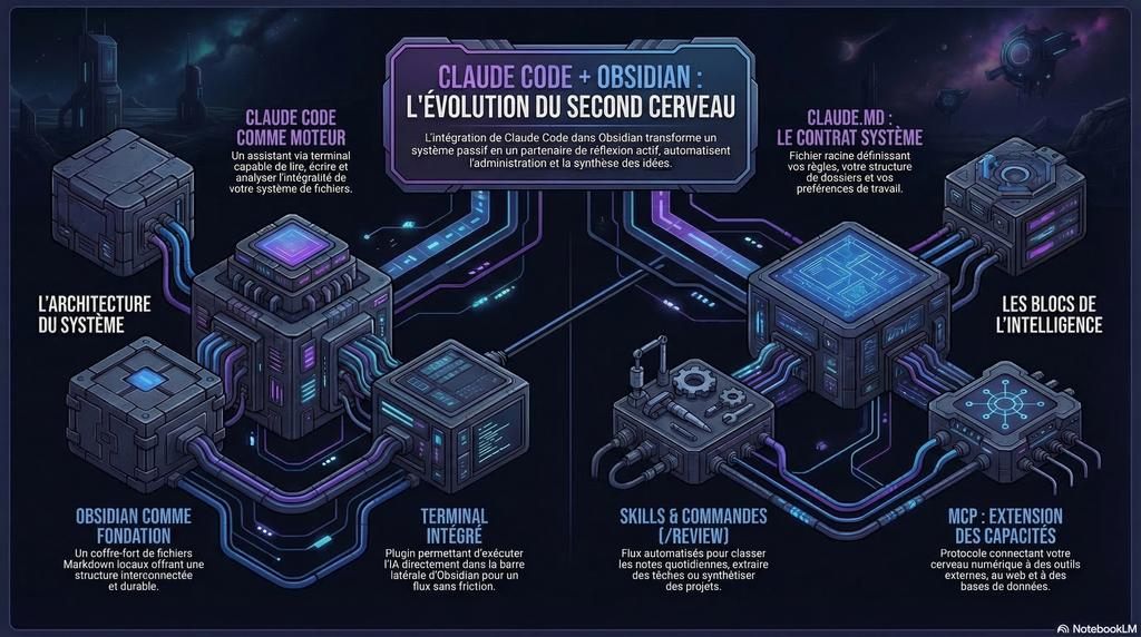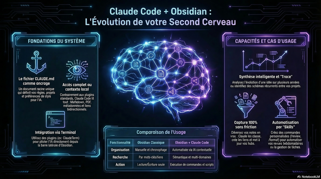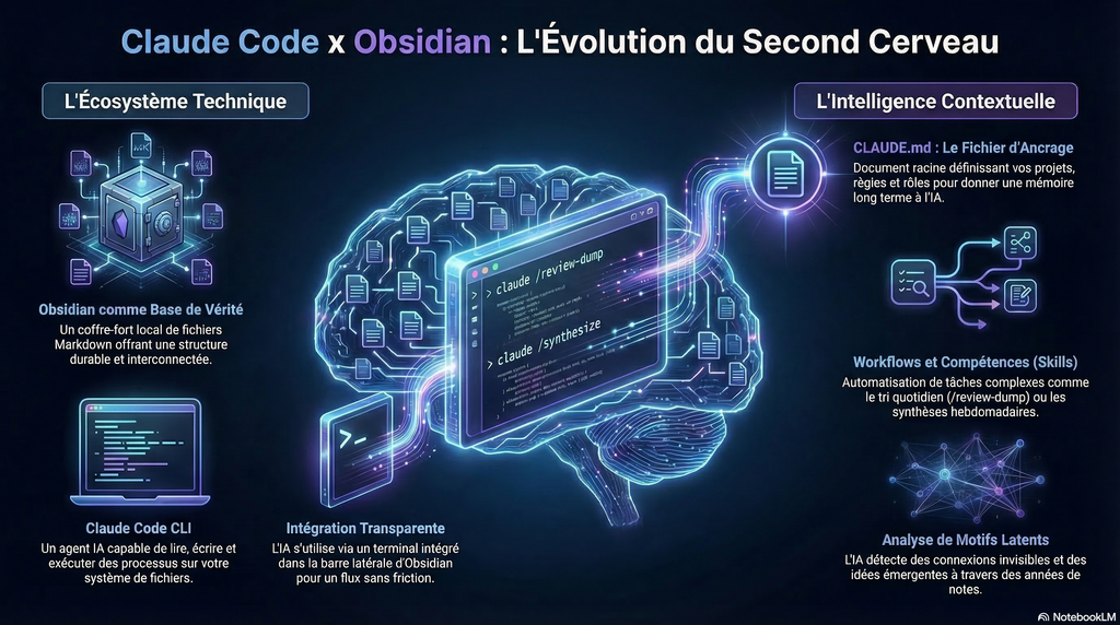 Ce n’est pas une solution magique. C’est un investissement de configuration, réel, qui prend quelques jours à mettre en place correctement. La différence entre un vault Obsidian et un vault Obsidian + Claude Code bien configuré, c’est la différence entre une bibliothèque et un collaborateur qui a lu tous les livres de cette bibliothèque et comprend comment tu travailles.